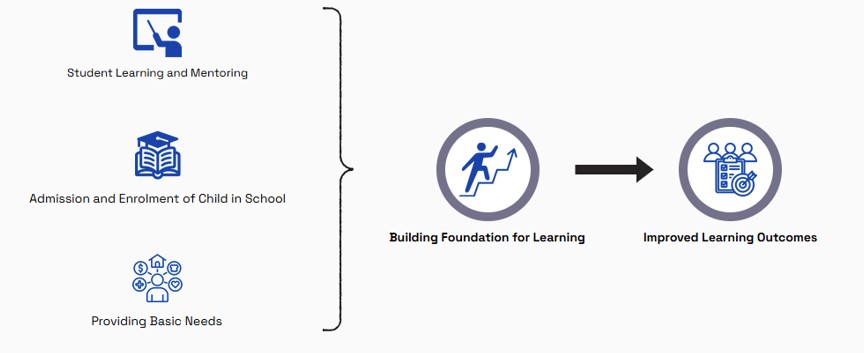 Learning in schools can improve only if the student is engaged in the classroom. We build strong base and foundation for child to be able to learn properly at school. We have strategies for (1) Student learning and mentoring, (2) Admission and enrolment of child in school and (3) Providing basic needs to improve learning outcomes of students.